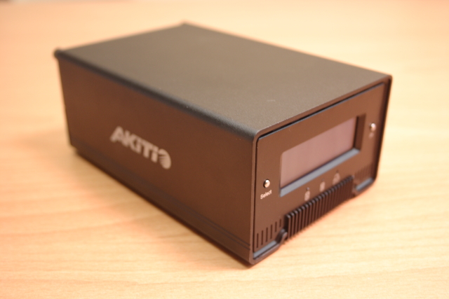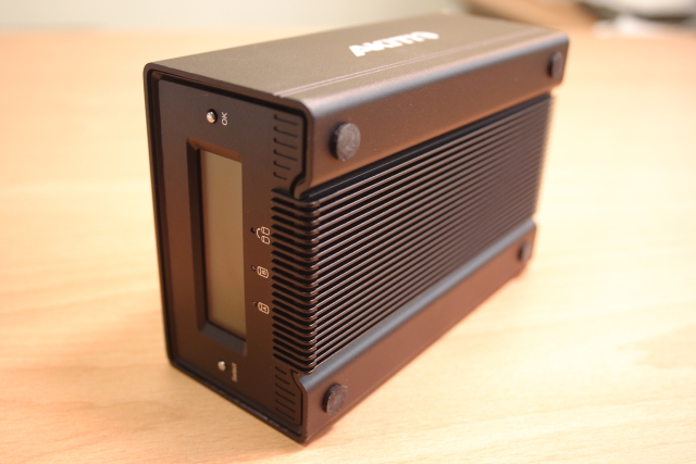 ▲硬碟盒正面有 LCD 面板可以即時顯示內部硬碟陣列模式、 硬碟大小容量、工作溫度、風扇轉速、、等等相關資訊,