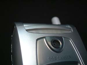 Sanyo J100 具備了內建數位相機,所以上蓋很明顯的,中央有個小小的鏡頭;但眼尖的朋友可能會發現其上方還有一條白色弧形透明玻璃看起來挺奇怪的?是裝飾嗎?不是的,那可是內建閃光燈喔!這正是 Sanyo J100 的最大特色,而 Sanyo J100 也是市面上第一台擁有閃光燈的內建數位相機。