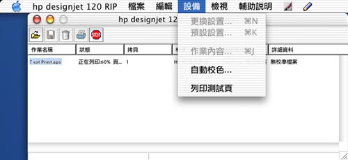 燦哥在下我的設備為 G4 + OSX ,選了一個 A4 滿版圖片約 20MB 的檔案軟體,傳送時間不計, HP Designjet 120 使用「Premium 600 x 1200」模式列印,約莫 5 分鐘即可 Rip + 列印完畢了。同檔案在下使用 Epson Stylus Color 3000,使用「720 x 720」模式列印,(因無正確的 OS X Driver 所以使用了 EPSON 通用驅動程式)+EPSON RIP (傳送至 Apple 7100/66 Printer Server)則花了將近 7 分鐘 30 秒。至於其他大尺寸列印則相對的比較不一,滿版圖片的 A1 有時候可能得花上大半個小時呢!因為圖片色彩較為複雜的因素吧!當然列印解析度和用紙模式也有相對的影響。