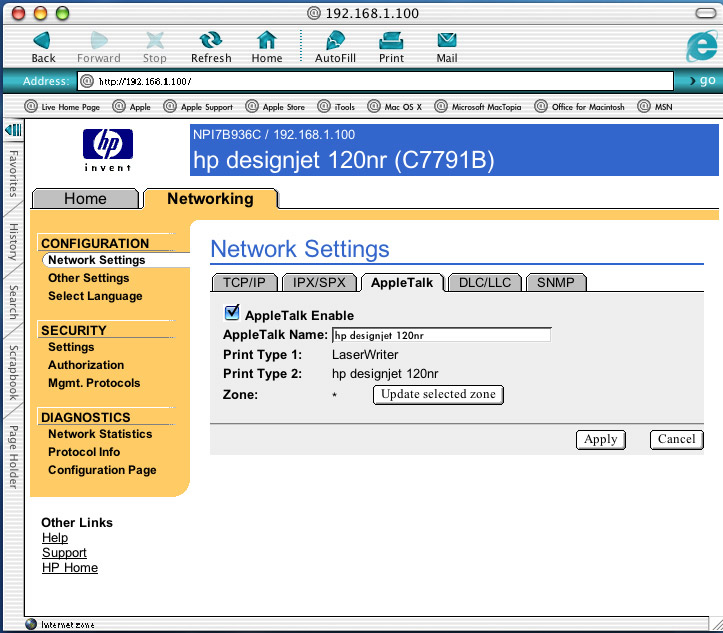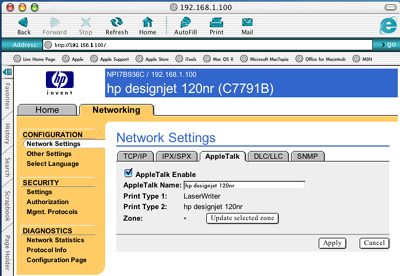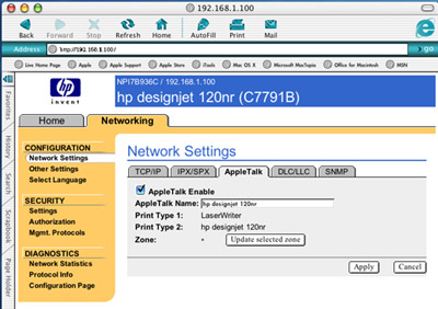 也就是說 Mac 的使用者在不選購 HP Jetdirect 615n 網卡的情況下,仍然可以使用 USB 1.1 界面列印,架上 USB HUB仍然可以多台 PC 並行列印,而增購 HP Jetdirect 615n 網卡後即可升級成為網路列印伺服器了,在 Mac 界面下更可選擇 TCP/IP 或 AppleTalk 方式連結!在設定上更可透過 Web 界面做指定 IP 或各項設定呢!