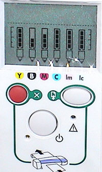 HP DesignJet 120 狀況顯示面板雖然採用 1.2 吋(相當於一般 DV 側邊螢幕)黑白液晶螢幕顯示,不但可以隨時顯示目前剩餘墨量,資料傳輸時也可顯示訊息接收情形、運行狀態(包括卡紙、進紙狀況)等資訊,也就是把以前的燈號顯示方式,部份改為使用螢幕顯示。然而燦哥最不懂的地方,既然使用了液晶螢幕顯示,顯示的訊息卻不是很明確,對於故障排除的指示更是闕如,實在可惜呢! HP 應該好好善用這個可以顯示更多資訊的螢幕才對;不過以目前的顯示資訊來看,已經很令燦哥我感動了。