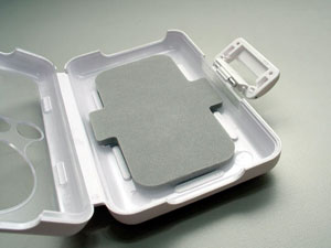 打開 Showcase 的時候,會發現裡面有一個十字形灰色的泡綿,這個是給較薄的 10G 、 15G 、 20G 的機種使用的,因為他們的高度較薄。這灰色泡綿的十字形狀設計的可以剛好放在 Showcase 裡面的防滑邊條所圍成的範圍之內,讓高度較薄機種也可以密合的放在 Showcase 裡面,但是可惜的是,這麼一來就不能看到美美的 Apple Logo 了。