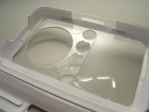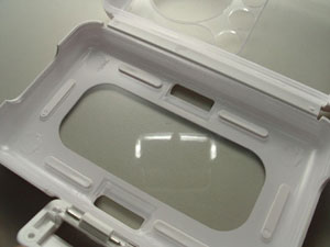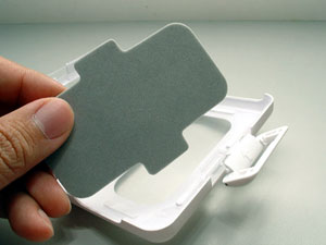 為了要安裝 iPod ,當然需要做的比 iPod 大一些才能將 iPod 放進去囉,我們心愛的 iPod 會不會在裡面晃來晃去,左撞右撞哩?不用擔心,打開 Showcase 後,會發現正面與背面兩邊都各有六條軟矽膠的防滑邊條,為的就是讓 iPod 能安全地躺在裡面,不會因為硬碰硬而刮傷了心愛的 iPod 。由於是矽膠,加上 iPod 的表面很光滑,所以安裝後密合度很高,不會晃,大家可以放心喔。