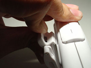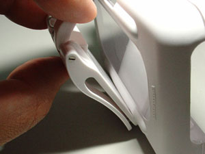 Showcase 的背夾是可以拆卸的,所以喜歡將心愛的 iPod 放在包包裡或是拿在手上的朋友可以不要安裝它,並不會影響 Showcase 的功能。拆裝都很簡單,只要先將背夾的下方勾住插槽,再將上方的彈簧扣扳開扣在上方的插槽就完成了;要拆下來只要反向操作就可以了。
