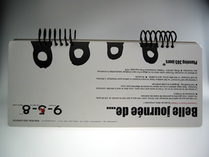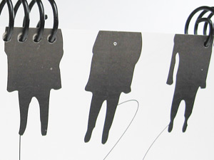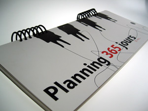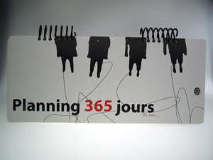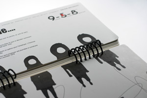 Bella Bella 365 周記本擁有 400 磅特殊紙的白色封面,上面飾以主體為黑色的字樣與圖案,整本檯曆闔上時,就非常引人注目。那四個黑色人物 Bella Bella 是著名的插畫家 Cola 為水越四位設計師所繪的人物畫,再經水越設計沈澱而成的人物。水越設計形容那畫「像太空人般漂浮著,真實但又游離」,其實不啻為現在工商社會人們每天朝八晚十、辛苦賣命的寫照。