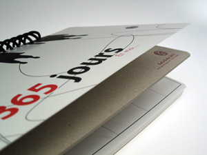 Bella Bella 365 周記本封面可是有學問的呢!除了把檯曆攤平就會發現原來封面與封底是同一張圖案外,仔細端詳上面的圖案,您就會發現其不是很平順光滑的,而是類似熱熔液體乾掉後所留下的不平均表面。這是因為其特別以「烤松香」的方式所製成,這是印刷時在油墨內加了松香粉然後加以加熱而成。這樣會讓油墨膨脹起來,有半浮雕的效果,而也由於油墨膨脹,所以表面不平順光滑的多變樣式也就成了這種設計的效果。所以其實每一本 Bella Bella 可說都不相同,因為乾的深淺程度所留下的層次感其實都不相同。此外,一般來說都無法烤那麼大的面積,因為實在難以控制最後的品質,由此可見水越設計的執著!