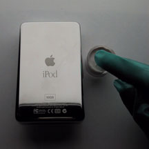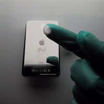 在完成了塑膠部份的清理工作之後,接著就可以把 iPod 翻過來,進行金屬部份的拋光工作。基於 iCleaner Pro 裡的金屬與深層研磨清潔劑裡具有強酸性的化學成份,我們強力建議您務必在開始工作前戴上隨 iCleaner Pro 所附送的乳膠手套,另外也不要使用清潔 iPod 塑膠部份時所使用的毛巾,以免化學藥品相互發生作用,因而減低了 iCleaner 的效力。