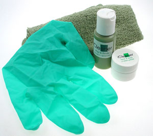 iCleaner Pro 這個清潔系統包括了一瓶 iCleaner 壓克力研磨清潔劑(綠色高瓶子)、一瓶金屬與深層研磨清潔劑(白色扁瓶子)、一副乳膠手套跟一條可供擦拭打光之用的純棉絨布毛巾所組成。