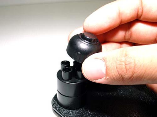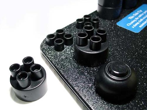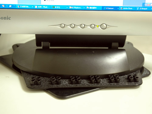 而較遠端也就是梯形「上底」的那一邊呢,則有六個裝置墊高墊的接腳,一個個圓形突起的形狀與「樂高」積木神似,隨貨附上六個墊高墊與四個頂端防滑墊,任使用者隨意將之安放在這六個接腳上。無論是墊高墊或是頂端防滑墊,其厚度分別為 1.2 與 1.6 公分,所以將之組合起來,左右兩邊分別可墊高至 5.6 公分左右,享有四種墊高方式,其墊高高度分別為 1.6 、 2.8 、 4.3 、 5.6 公分左右。這實際高度因為是實際將腳墊高度一一加上去計算而成,故會與單個高度乘以數量所計算出來的高度不吻合,其原因是腳墊彼此相堆疊時,會有一兩公釐的縫隙,所以也就造成了堆疊後總高度的增加了。