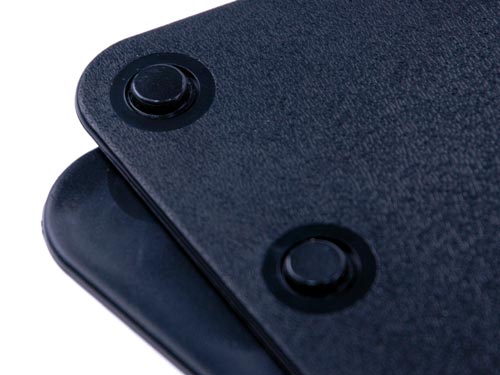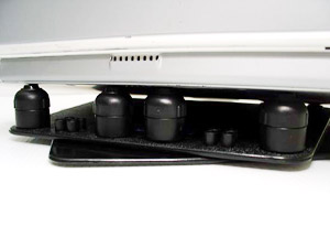 在下層的板子有六個腳墊,用以增加摩擦力,讓 Podium CoolPad 不會隨著使用者敲鍵打字而滑動,造成困擾。而在上層的板子上,靠使用者身體這端也就是梯形「下底」的邊緣處,有四個軟墊,作為抵住筆記型電腦的前緣,確保不會滑動。