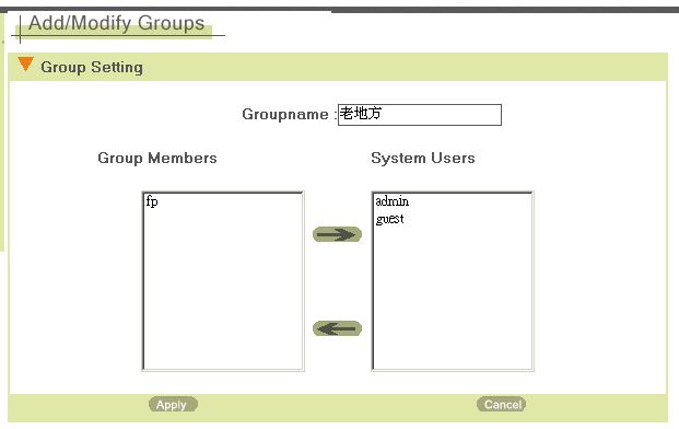 從 BOSS  Web管理界面左側功能表的「User Management」進入「User」或「Group」畫面,可以建立允許存取 BOSS 資料的使用者與群組,建立與設定使用群組可以方便使用者的劃分與管理,您可以使用中文來命名群組。使用者的建立與設定,在於產生有安全權限控管的使用者帳號與密碼,所有想要連線使用 BOSS 的使用者(不管是由外部 WAN 埠或是內部網路 LAN 埠連線),都必須輸入正確的使用者帳號與密碼,才被允許存取使用 BOSS 上的檔案。