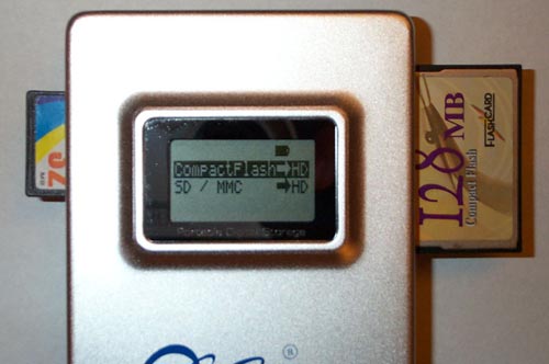插入記憶卡,開啟電源後,出現確認複製的畫面。此時只要按下行動碟盒旁的 OK 按鈕,既進行複製動作。如果說同時插入兩種規格的記憶卡,則 QCool 會詢問使用者要複製哪一片記憶卡的資料。資料的複製當中,還會以數據的方式告訴使用者複製的進度與所需時間?記憶卡轉錄的時間依記憶卡規格的不同而異)。有一點須要使用者注意的是,雖然 QCool 行動碟對硬碟有作些微的保護措施,但在硬碟運轉時盡量還是不要移動行動碟盒較為妥當。