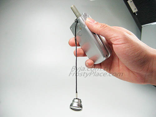 「Digital Lens」數位鏡頭的造型相當的有質感,全金屬銀灰色,搭配任何手機都很不錯,不會顯得突兀。隨產品有附上吊繩,利用一個橡皮圈套住鏡頭末端的凹槽,就可以將吊繩與鏡頭連接起來,這樣一來鏡頭可以當作吊飾一樣掛在手機上,隨時可以拿起來安裝使用。為了防止刮傷鏡頭,還有附上一個小的鏡頭蓋,這一點可說相當的用心喔。