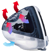 根據熱空氣上升﹑冷空氣下降的物理現象,被彩色映像管加熱了的空氣會從位在機身提把周圍的散熱孔流出,這時冷空氣就會因為熱空氣流走所造成的真空吸入去冷卻位在機身下方的主機板與