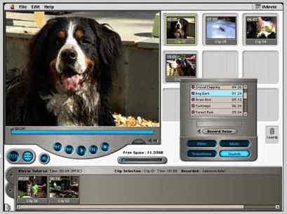 電影編輯程式。在 iMovie 下只需輕點滑鼠,電腦就會直接把記錄在 DV 攝影機上的電影片段下載回,藉著易學易懂但功能強大的剪接與特效工具,使用者可以迅速的安排場景與過鏡特效,並且根據需要加入音軌﹑特效以及字幕。