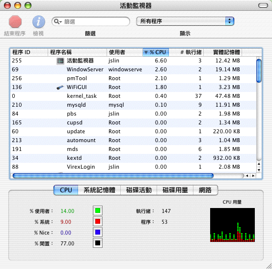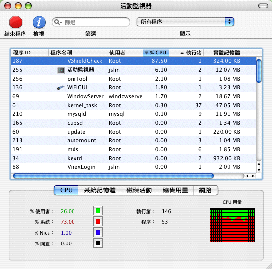 因此,我就在終端機底下打了幾個查詢系統資源耗用狀況的指令來觀察系統執行時的狀態,還真如我所料的,並不是系統新功能耗用太多的 CPU 資源,而是其他程式因為不適應新的系統環境(據說 Tiger 新增及修改了不少的系統組態以及 API ),水土不服而狂找 CPU 要資源,所以 CPU 當然都在接近滿載的狀態下執行,這要 PowerBook 不發熱才奇怪。我的 PowerBook 裡面因為有安裝了蘋果送給 .Mac 會員使用的 Virex 這個防毒軟體,它會安裝一個常駐軟體 –– VShieldCheck 到系統裡去監督一些活動,而這個軟體,大概是水土不服(可能有些 API 在新系統改過了),瘋狂地一直執行著。
