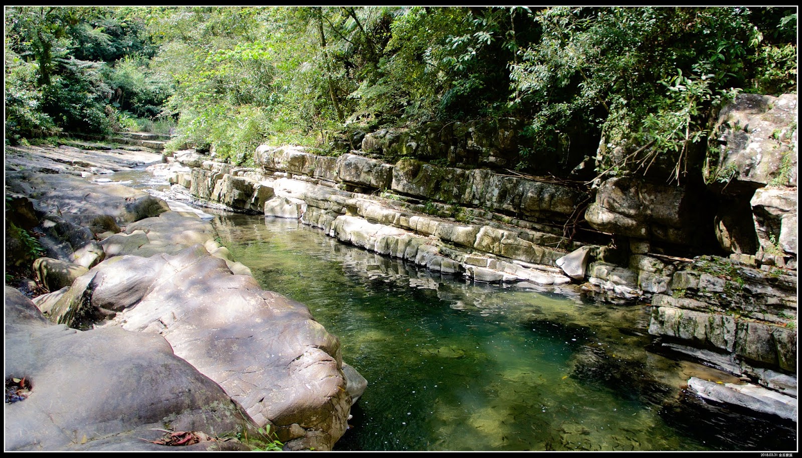 這是在〖魚蕨步道〗眺望金瓜寮溪一段溪谷岩層風光。